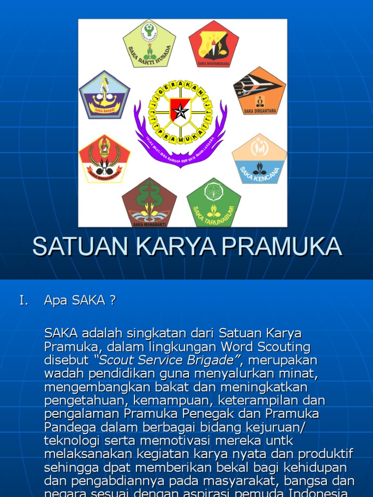 Semenjak tahun 1909 sudah dikenal istilah Sea Scouts yang diadakan oleh kepramukaan Inggris. Lambang Saka Kencana berbentuk segi lima beraturan dengan panjang sisi masing-masing berukuran 5 cm. Jenis-jenis pertemuan Pramuka ini dapat kita bedakan berdasarkan.